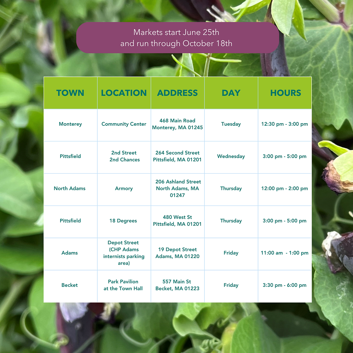 The mission of the Berkshire Mobile Farmers Market is to bring fresh, locally-grown food to areas in our community of low income and/or low access (to a grocery store or other market). We ran a successful 10-week pilot season last fall and will be back this summer at 6 sites throughout Berkshire County! Shoppers will find a variety of seasonal produce at the market, as well as other food staples such as eggs, meat, dairy products, bread, maple syrup and honey. All products are locally sourced. We strive to make shopping at the market a stigma-free, welcoming experience for all. We offer a FairShare payment system, where shoppers can select a payment tier based on their unique budget and needs.